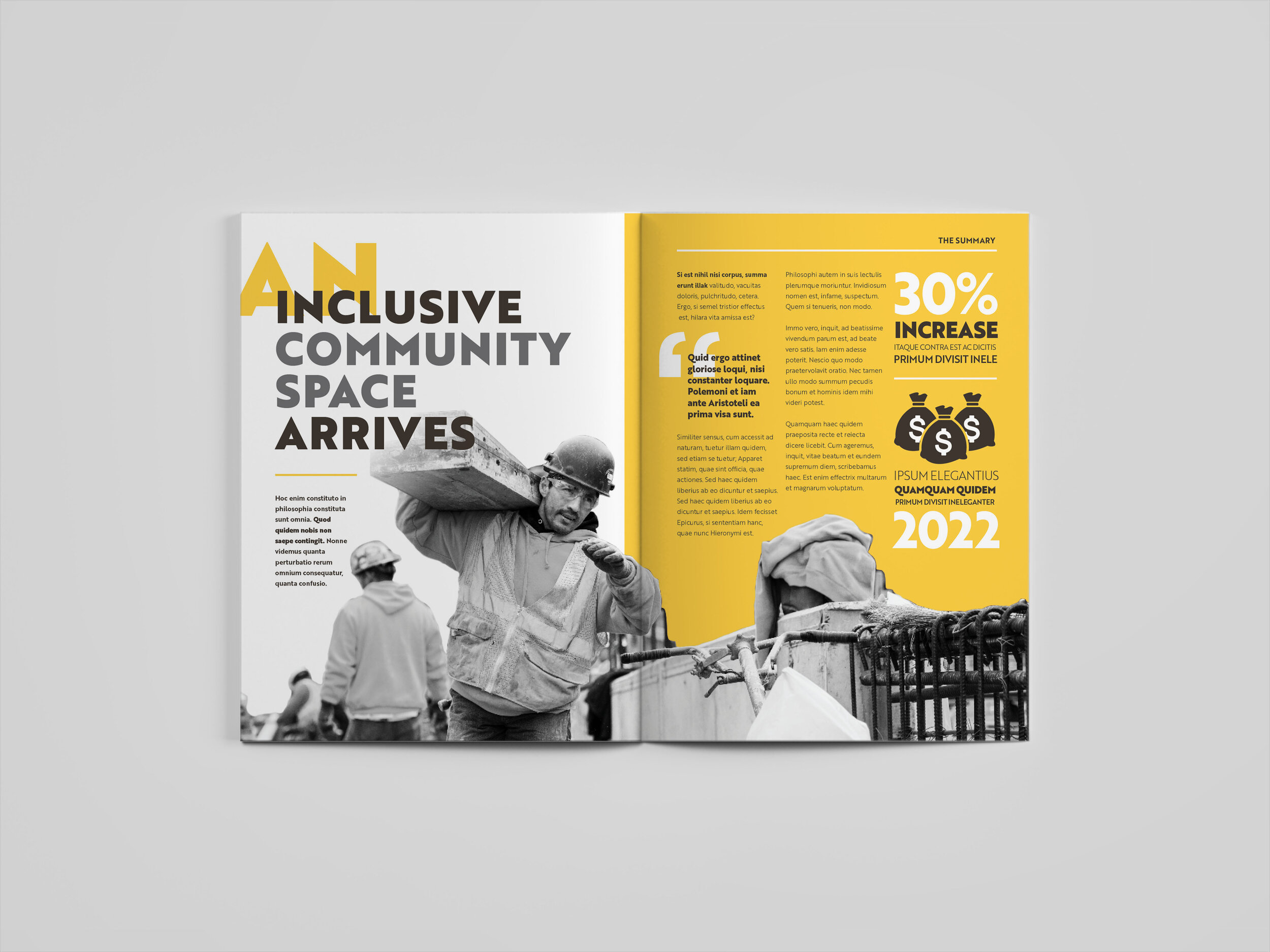 Two concept designs for a convention center in New York City featuring a cover option and two interior spreads. Using a bright yellow from their brand guidelines, I contrasted this pop of color with masked, black and white imagery. These colors paired with large, bold typography creates strong contrast. Since the design was an annual report where data is heavily emphasized, statistics were pulled out so that the reader can quickly grasp bits of information in an easy-to-read format.